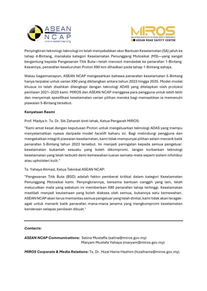 As a result, the Proton X90’s overall rating is now limited to 1 Star level, the statement said.