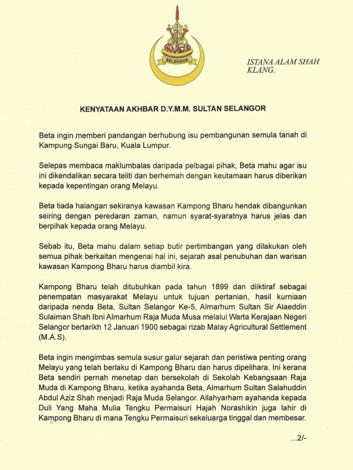 “Therefore, every effort to develop or develop in Kampong Bharu must take into account the interests of Malays for now and for the long run,” said Sultan Selangor.